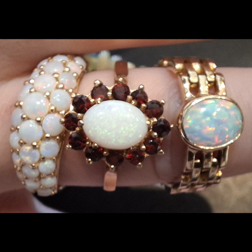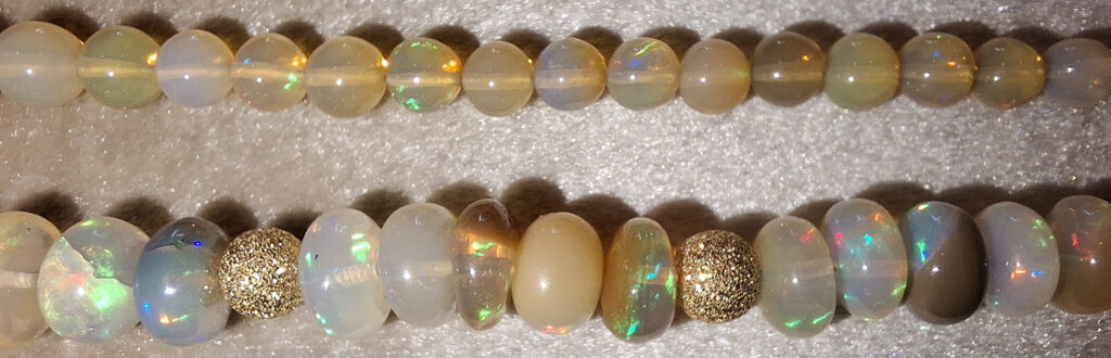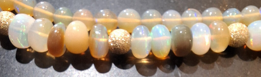Een opaal is een amorfe, niet kristallijne edelsteen die ook wel wordt gezien als ‘kwarts-gel’ door de het hoge water gehalte van de steen – tot wel 20 procent. De basiskleur van de steen kan enorm verschillen: ‘melkopaal’ heeft een witte of licht gelige basiskleur, en ‘zwarte opaal’ een bruine, grijze of zwarte grondmassa. Als vreemde eend in de bijt is er nog de ‘vuuropaal’ die doorzichtig fel oranje is. Alle opalen laten een prachtig kleurenspel zien: alle kleuren van de regenboog kunnen voorbij komen als oplichtende vlakjes, waarbij het meestal wel zo is dat één kleur overheerst – de ene steen heeft meer rood, en een andere meer groen, oranje, violet, … Deze ‘colour flashes’ zie je goed bij bolrond ofwel cabochon geslepen stenen wanneer je ze in het licht zachtjes draait – een fonkelend spektakel waardoor je meteen weet: dit is een opaal. In moderne sieraden wordt ook wel ‘boulder opaal‘ gebruikt, een combinatie van opaal ingebed in het moedergesteente [matrix of “host rock”], het contrast is waanzinnig mooi.