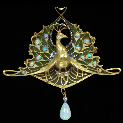Uit de collectie van het Victoria & Albert Museum, London links een ring uit ca 1890, een Franse Art Nouveau hanger en rechts voorbeelden van vintage ringen uit de collectie van Zilver.nl