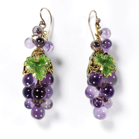 Dat sieraden tijdloos zijn zie je goed aan de linkerfoto: deze ketting is gemaakt door de Romeinen in ongeveer de eerste eeuw na Christus. Nog steeds verrassend draagbaar, toch? De oorhangers op de middelste foto zijn Frans en komen uit ongeveer 1850 – kijk even hoe mooi de verschillende kleurgradaties amethist als druiven zijn verwerkt. Rechts een hanger met dieppaarse amethist, gemaakt in Londen in ongeveer 1880 [alle foto’s: collectie Victoria & Albert Museum, London].